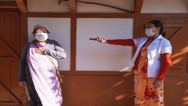 Community Health Officer (CHO) Ibaiada Syiemlieh conducts a tuberculosis screening using the Cough Against Tuberculosis (CAT) mobile application for Joylyone Lamare during a community visit in Shilliang Myntang village, West Jaintia Hills district, Meghalaya, India. CAT is an AI-powered, cough-sound–based screening tool used under the National Tuberculosis Elimination Programme (NTEP) to support early identification of individuals at risk and timely referral for diagnosis. Note: The participant briefly posed to visually document the screening process and correct use of the CAT application. Photo by Rohit Jain