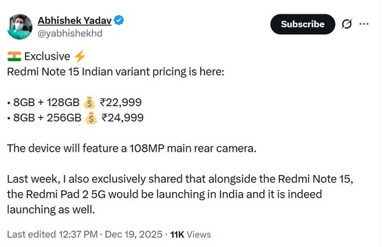 A leak shared by tipster Abhishek Yadav (@yabhishekhd) on X indicates that the Redmi Note 15 5G is anticipated to be priced at ₹22,999 for the base model featuring 8GB RAM and 128GB storage. The high-end variant, also with 8GB RAM but boasting 256GB of internal storage, may be priced at ₹24,999.